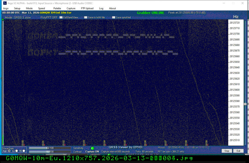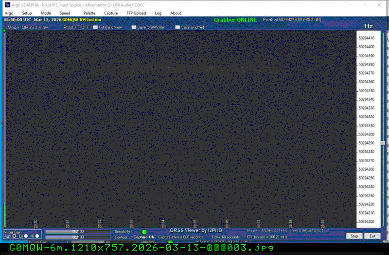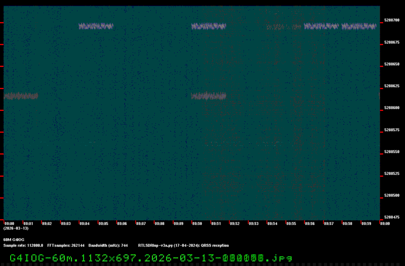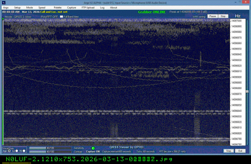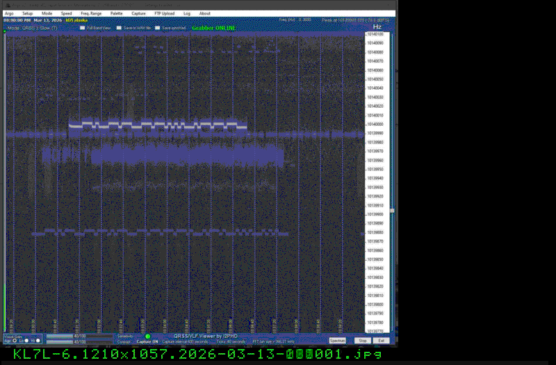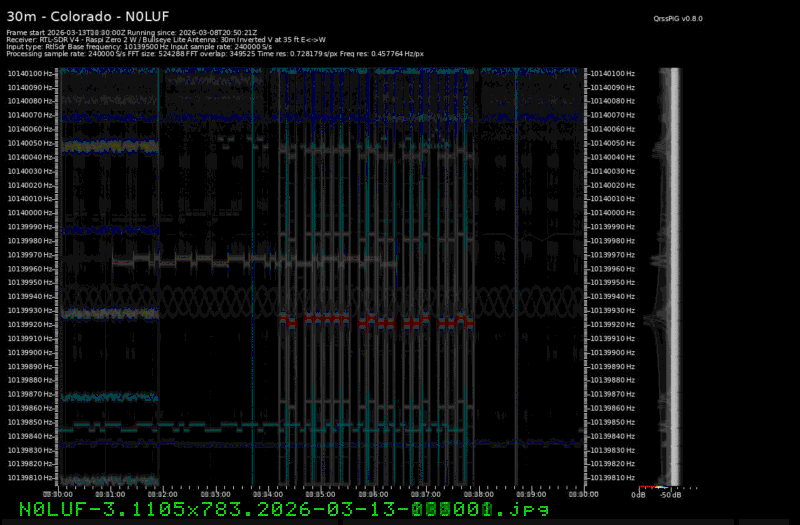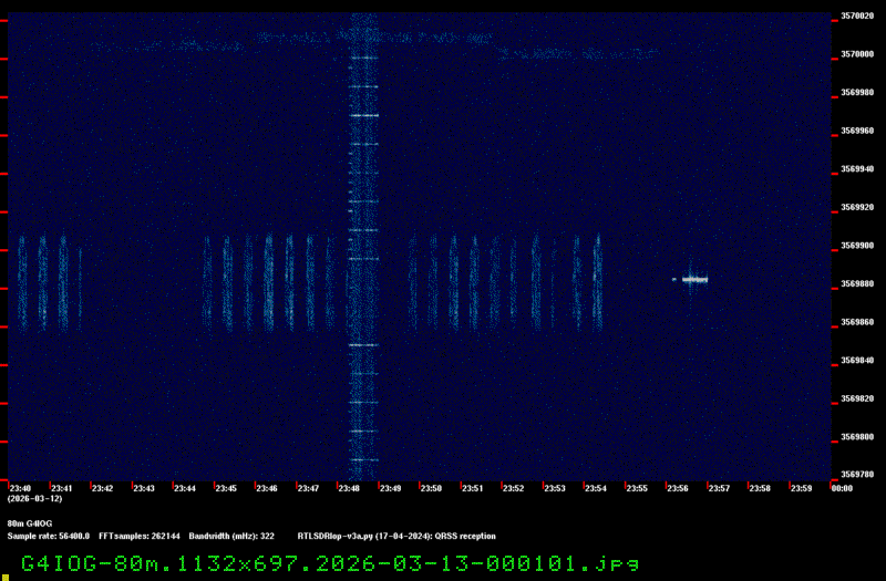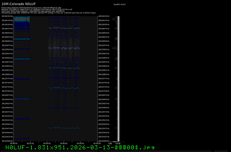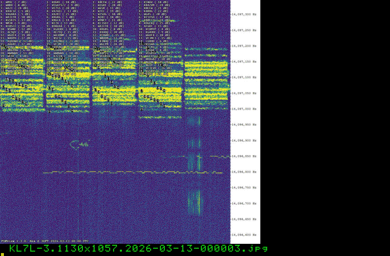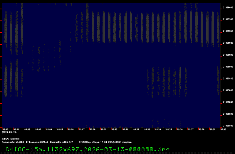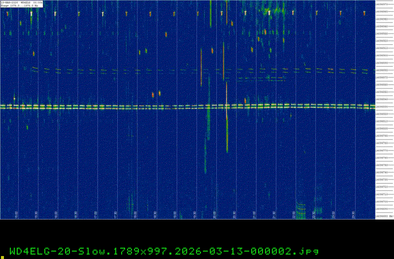 For each source, data is grouped by Zulu day. For each source on each zulu day, there are two images, composed of frames which are images seized from qrss grabbers. The image on the left is the average of all the frames; the one on the right is an animated GIF made up of all the frames. A caption in green tells what the source was, prehaps the band, and roughly what time the image was made or seized.